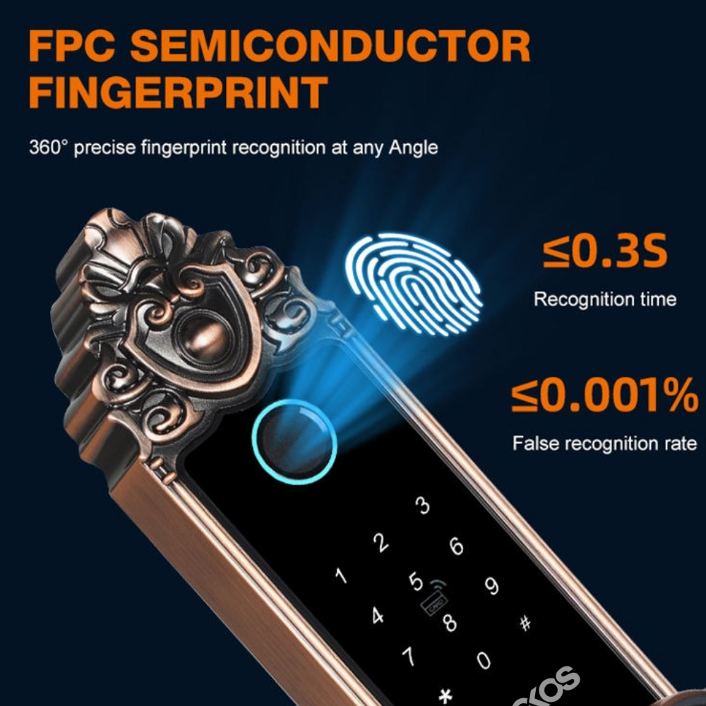 Okos Smart OKV993-TY Lock is an advanced, multifunctional smart lock designed to combine modern convenience with high-security features for residential and commercial applications. With its sleek and durable zinc alloy construction, this lock offers multiple unlocking methods, including biometric fingerprint recognition, PIN code, RFID cards, Okos Smart App (Android/iOS), and a traditional mechanical key for emergencies. Its high-speed fingerprint sensor ensures quick and accurate access, while anti-peeping password technology adds an extra layer of protection against unauthorized access. The lock integrates seamlessly with Wi-Fi, allowing users to remotely monitor, lock, and unlock their doors in real-time through their mobile devices, as well as receive notifications and access logs to track usage. Additional features, such as an auto-locking mechanism, low-battery alerts, emergency USB power support, and a built-in alarm system for tampering or break-in attempts, make it an ideal choice for those seeking convenience without compromising safety.