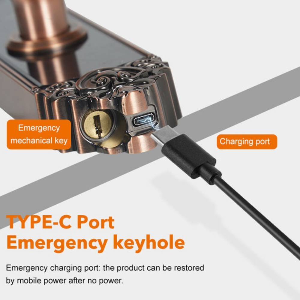 Use Case: When the smart lock's battery is completely drained, you can connect a power bank or USB charger temporarily to power the lock and gain access.